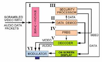 Este bloco consiste num processador de segurança, ao qual são entregues os sinais de controlo do sistema, e que vai efectuar o processamento necessário, afim de determinar quais os conjuntos de serviços (tipicamente um pacote de canais) a que o acesso está autorizado.