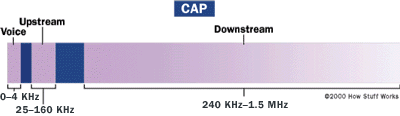 A modulação CAP ( Carrier Amplitude/Phase ) funciona apenas com multiplexagem por divisão de frequência (FDM). O canal destinado ao envio de dados ( upstream ) ocupa a banda dos 25 a 160 KHz e o de recepção ( downstream ) o intervalo de 240 a 1500KHz. A modulação CAP é semelhante à modulação QAM, mas com supressão da portadora. (ver figura 7).