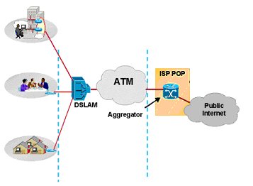 Na tecnologia ADSL, a primeira ligação é efectuada entre os ATU-R (modems ADSL dos clientes) e os ATU-C (dispositivos da central telefónica). Os ATU-C são multiplexados pelo DSLAM e enviados para uma linha ATM ( Asynchronous Transfer Mode ) de alto débito que está ligada à Internet. Esta ligação transporta os dados pela rede ATM até ao ISP (fornecedor de acesso Internet, que deverá ter ligado à rede ATM um servidor POP ( Point of Presence ), para permitir a ligação efectiva à Internet.