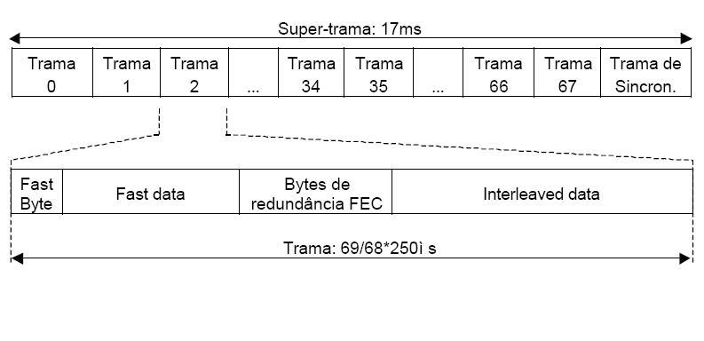 No transporte de dados é usado uma super-trama ( super-frame ) composta de 69 tramas (68 transportam informação e 1 transporta o símbolo de sincronização) de período 17ms.